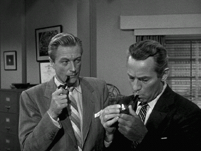 And just why is Richard Denning, as Dr. Chet Walker, brandishing that pipe with such vim and vigor? Because our hero is stimulating his mighty brain with tobacco à la Sherlock Holmes to solve a bizarre mystery. Even a scientist colleague (Nelson Leigh) that he confers with on the case also smokes a pipe and offers him some of his special blend. Great minds stink alike, I guess.